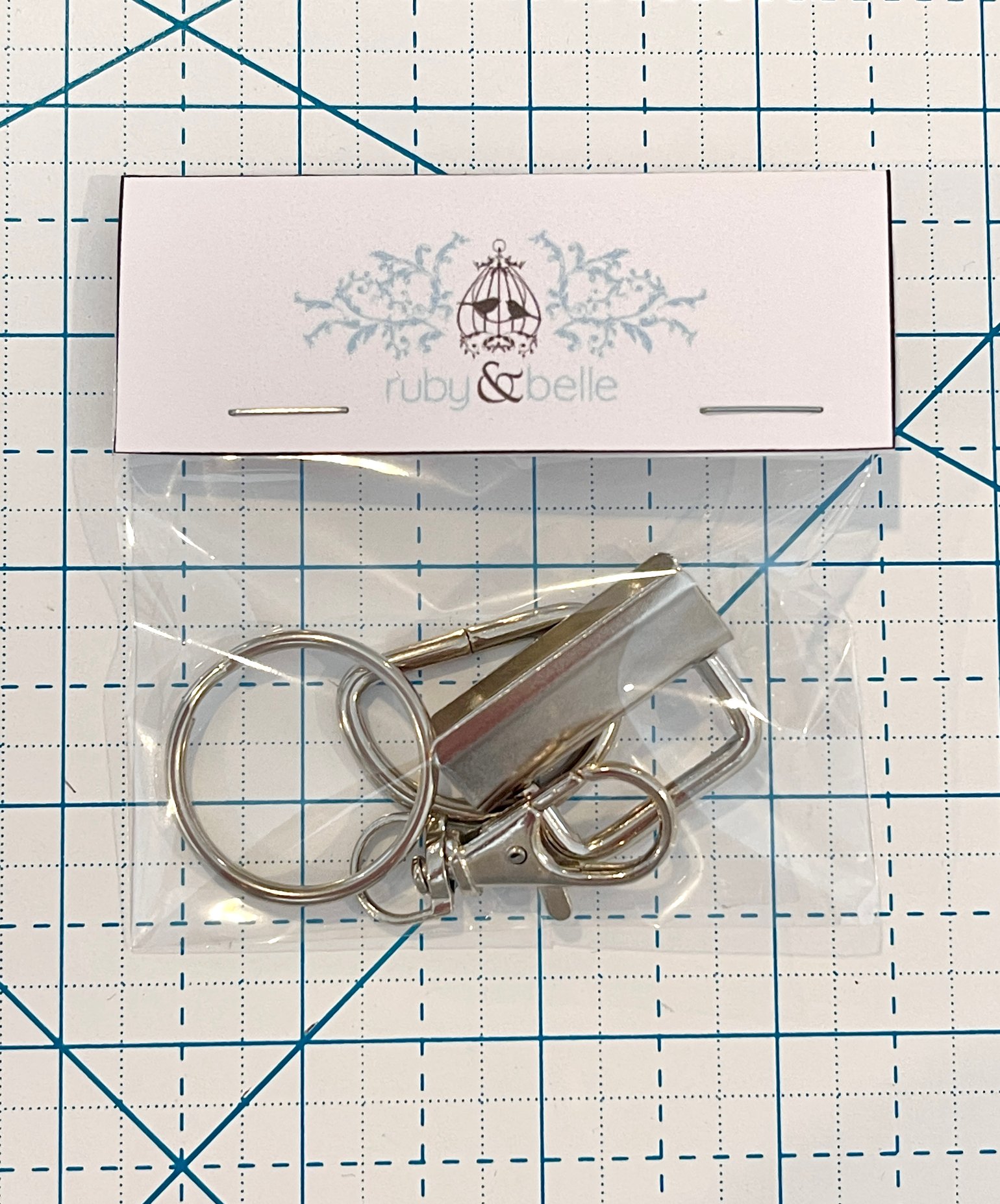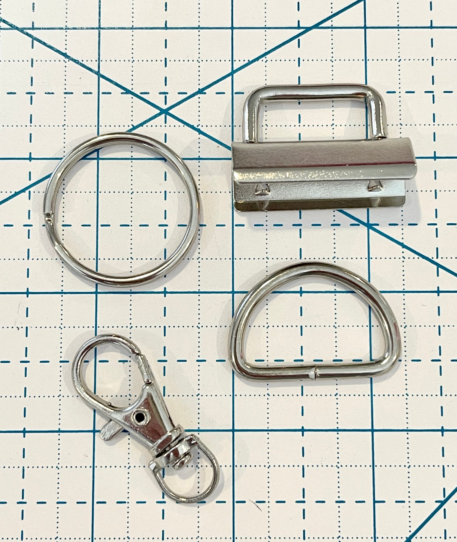 Hardware pack to complete the Charlotte Bag. Included in the pack is the D ring, swivel hook, wristlet clip and a split ring. Silver