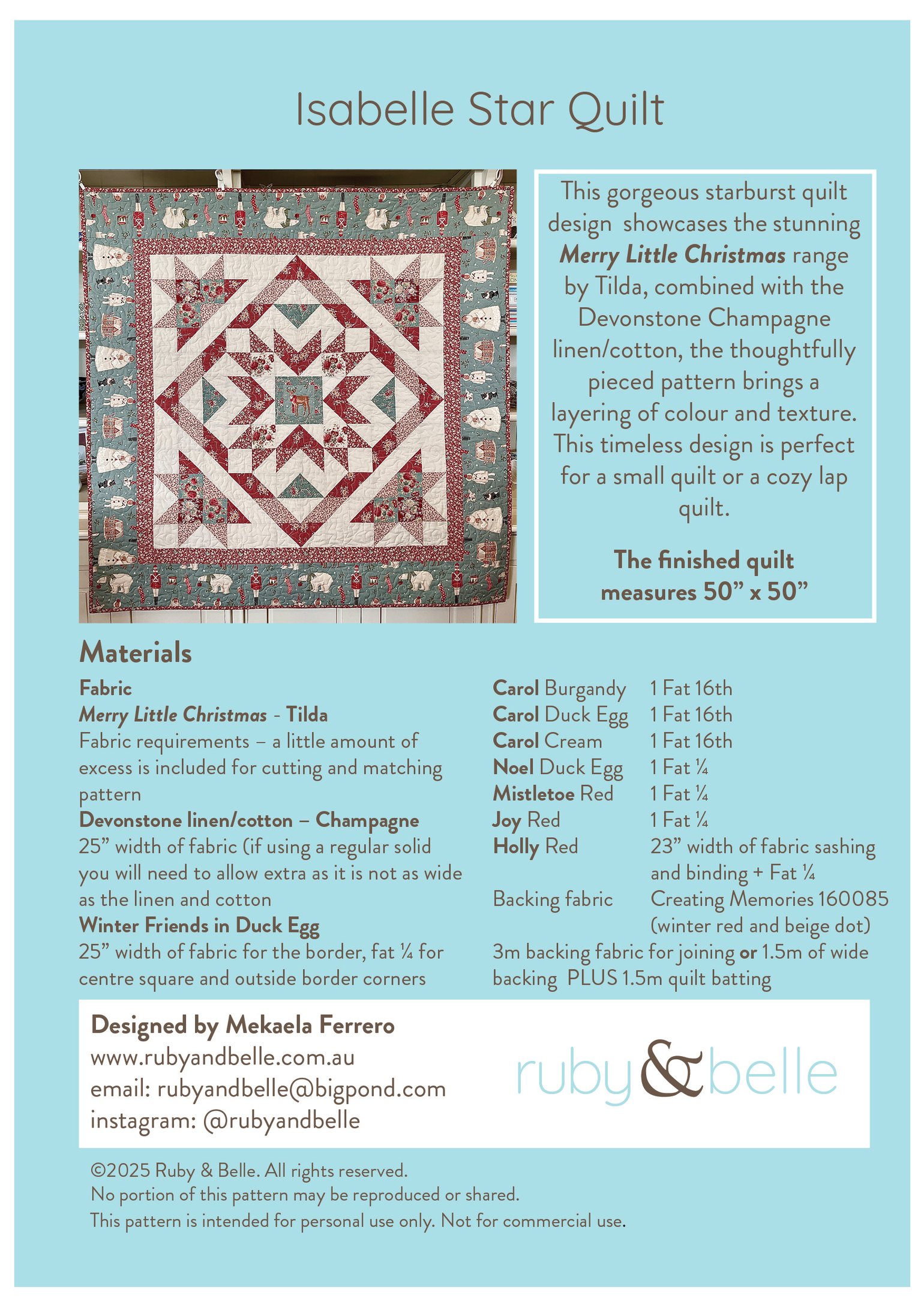 This gorgeous star burst Quilt was designed to showcase the stunning Merry Little Christmas fabric range by Tilda . Combined with Devonstone's Champagne linen cotton. The thoughtfully pieced pattern brings a layer of colour and texture.